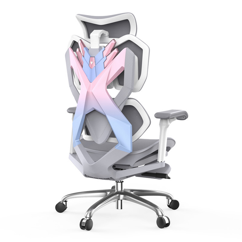 独角兽系列电竞椅的靠背采用 三区弹力 + 弹性悬挂 方案:肩部区、脊柱区、下背区分别对应不同弹性支撑,通过连接件形成柔性整体。女生伏案写字、端坐开黑、懒靠追剧、手柄半躺切换时,电竞椅靠背会随着背部压力变化自动略微形变,实现动态贴合,比传统一整块硬壳靠背的电竞椅在包裹感和适配性上有明显优势。